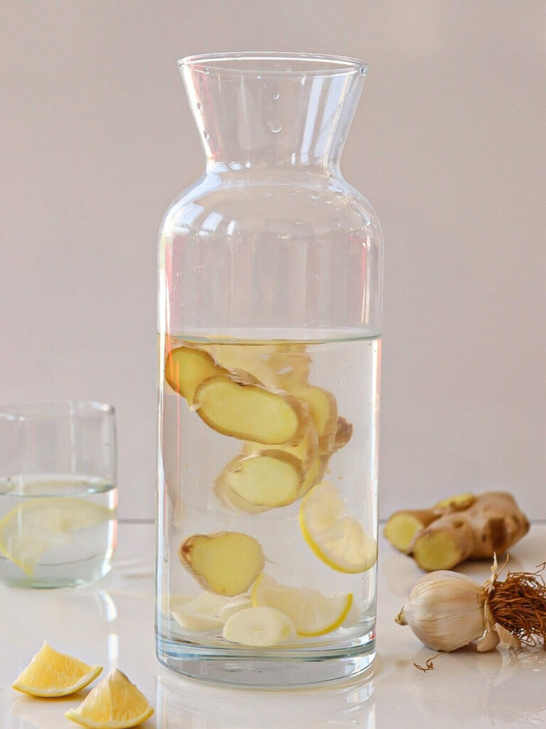 - Pour the fresh lemon juice into a pitcher and add ginger and garlic. You can add some basil leaves for extra detoxifying benefits. Add sliced lemon pieces.