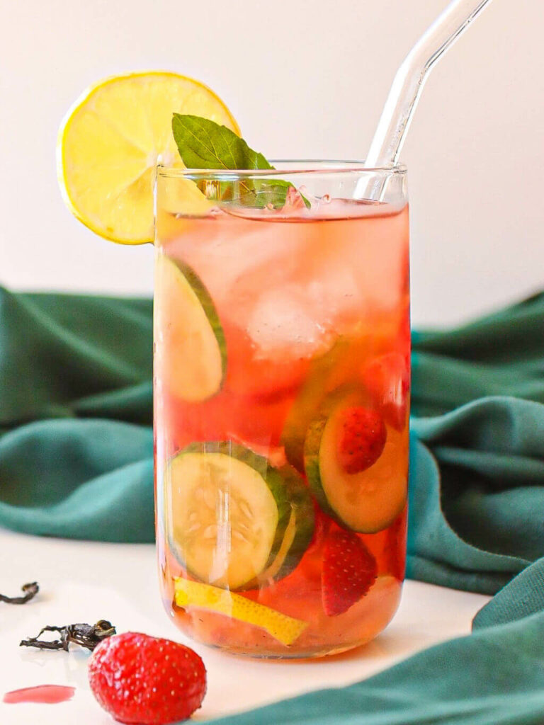2. Add the sliced lemon, strawberries, and cucumber to the tea.